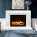 At its heart lies the advanced Celsi DLX panoramic electric fire, a glass-fronted feature that creates a captivating display of flames and glowing embers. The surround is finished in Soft White, paired with a distinctive double-stepped hearth design, providing a stylish contrast that enhances the overall appearance.