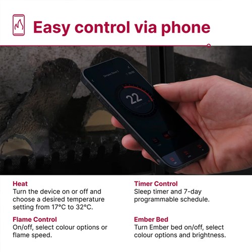 Customisable Display – Six ember bed colours, three flame speeds, and adjustable brightness.