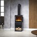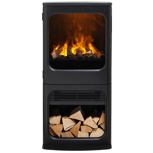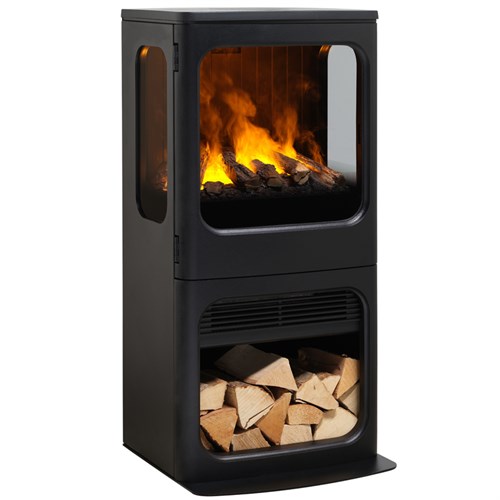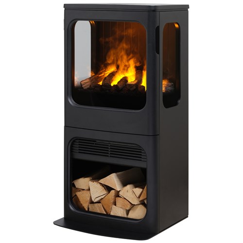 Taller freestanding Optimyst stove with log store plinth for extra height and presence