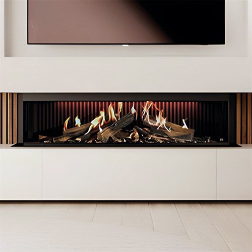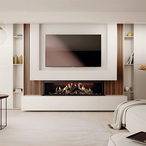 The three-sided design dramatically enhances this effect. By allowing the flames to be viewed from the front and both sides, the fire becomes a central feature rather than a single viewing point. This makes it an excellent choice for large media walls, open-plan living areas or feature installations where the fire is intended to be admired from multiple positions in the room. The glass edges create a clean, contemporary aesthetic that feels light and architectural rather than boxed in.