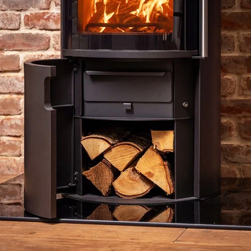 Hidden log store behind the lower door for tidy, convenient storage