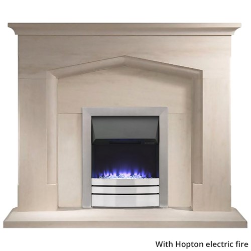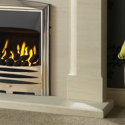 As illustrated in the image, the Coniston suite looks particularly impressive when paired with the Gallery Solaris gas fire, whose polished fascia contrasts beautifully with the soft tones of the limestone surround. The flickering flames create a warm and inviting ambience that enhances the natural character of the stone. However, the Coniston has been designed to work with any standard 16" inset gas or electric fire, allowing homeowners to choose a model that best suits their heating requirements and personal taste.