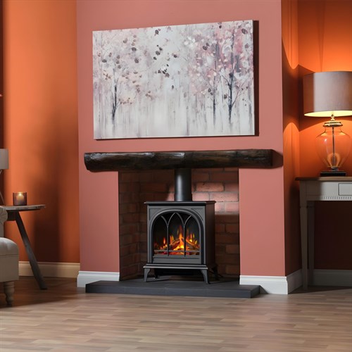Bring the elegance of traditional stove design into your home with the Wildfire Ravel 400T Electric Stove. Inspired by the look of classic wood burners, the 400T features a distinctive Gothic Arch window that sets it apart from the plain glass style of the 400C model. This unique detail makes it a superb choice for period homes, country cottages, or interiors that celebrate timeless character.
