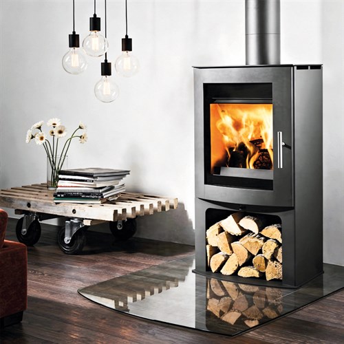 The integrated log store is both practical and visually appealing, keeping logs and kindling close at hand while contributing to the stove’s tall, balanced appearance.